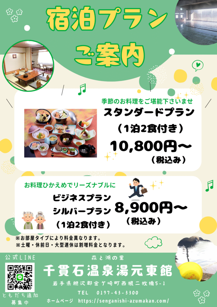 『Free Wi-Fi』のご案内 館内には『Free Wi-Fi』があるのでビジネスで宿泊をする方など、ぜひご利用ください(^^♪ 日帰り入浴の方でも1Fロビーでご利用いただけます☆ SSID:senganishionsen-loungePW:0197433300 お問い合せ TEL 0197-43-3300 ホーム... -
