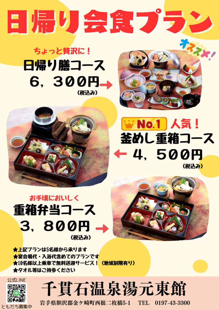 2025年7月10日現在 各コース料金(税込) ・重箱弁当コース 3,800円(茶碗蒸し付)・重箱弁当コース 4,500円(釜めし付)・お膳コース 6,300円 ※料金に含まれるもの 料理代 + 室料 + 入浴料 重箱弁当コース 3,800円 ※写真はイメージです。 ... -