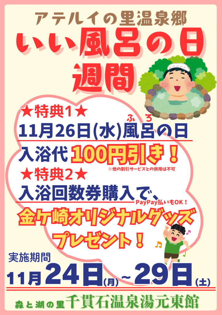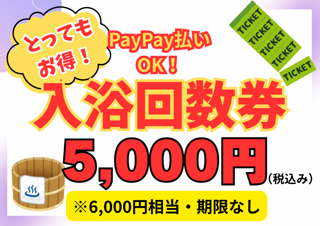 2025年11月21日 千貫石温泉湯元東館では入浴回数券6,000円分を5,000円で販売中です! 今まで「現金のみ」のお支払いでしたが2025年11月より「PayPay」でのお支払いも可能となりました。 期限もありませんので温泉好きの方、ぜひ購入していってください! ... -